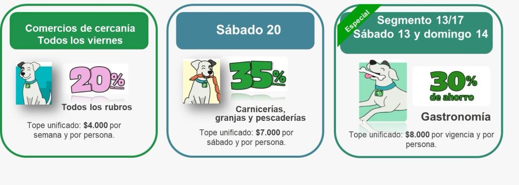 Comercios de cercanía: 20% de descuento todos los viernes. Tope de $4.000 por viernes, que se alcanza con $20.000 en consumos.